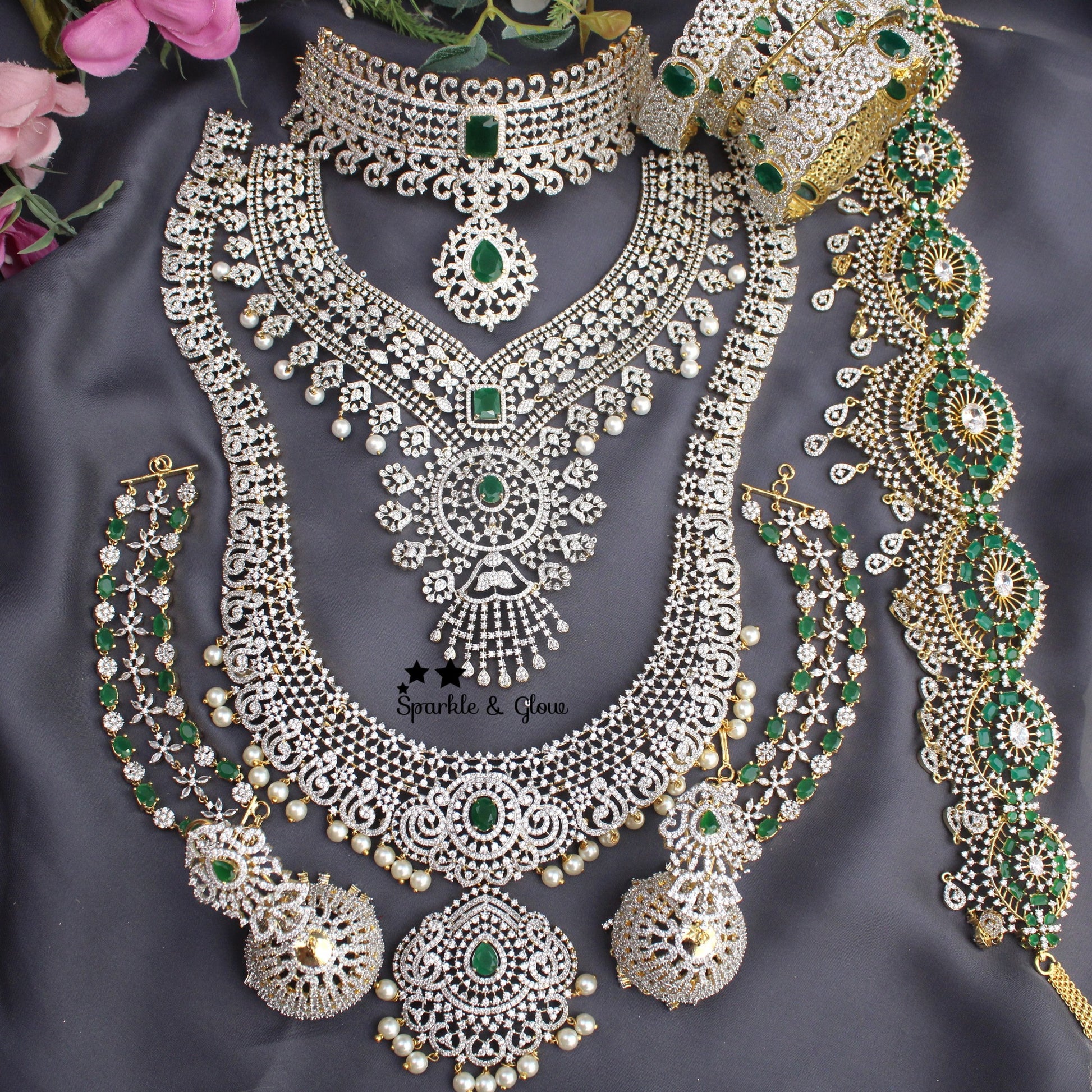 Gorgeous floral american diamond bridal set with emerald with mang tikka - green